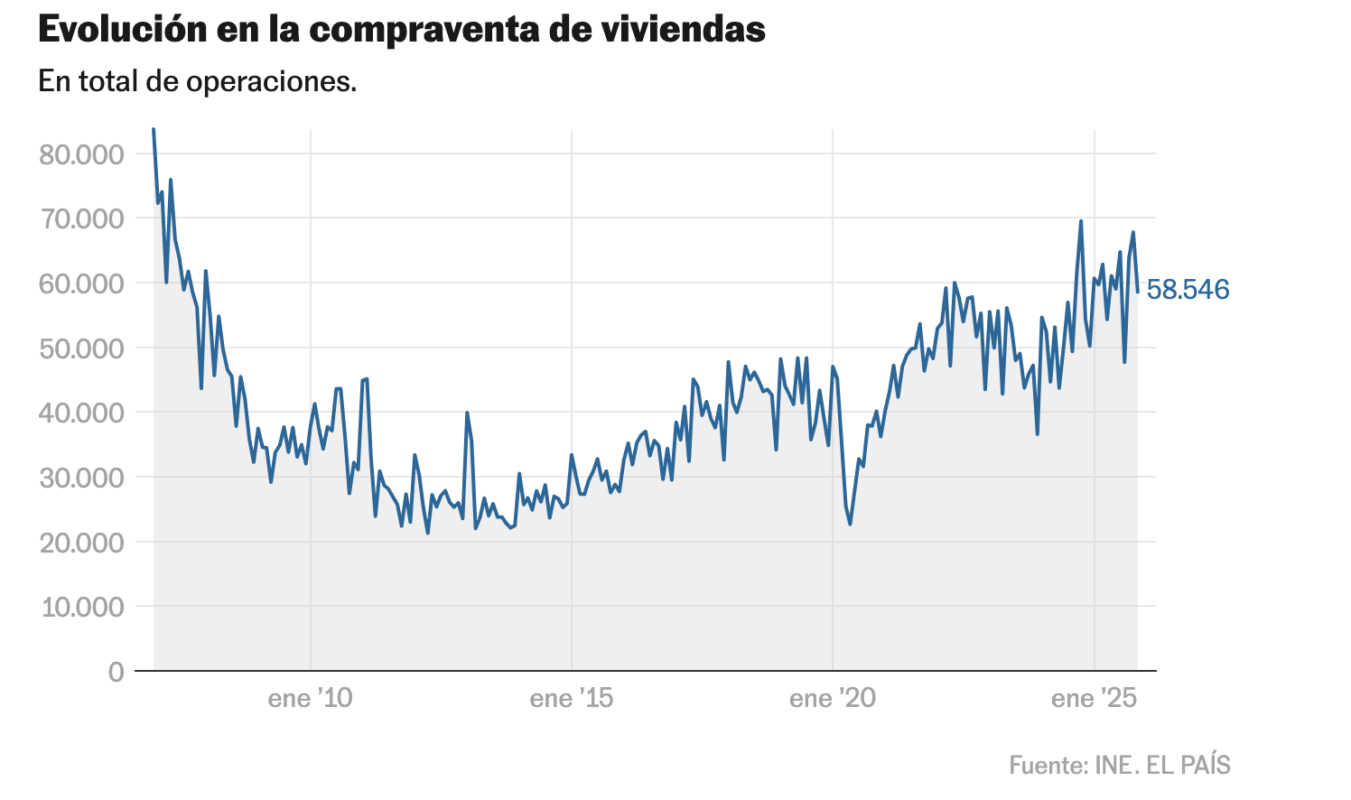 De acuerdo con los datos publicados este lunes por el Instituto Nacional de Estadística (INE), pese a que en noviembre se vendieron menos casas que en octubre, 58.546 concretamente, fueron suficientes para que, sumadas al resto de las operaciones que se han dado a lo largo del año, estas superen el total de ventas de todo 2024. Así, a falta de un mes contable para culminar el ejercicio de 2025, se habían consumado ya 662.114 operaciones, casi 20.000 más que en todo el curso anterior al completo. El volumen de ventas registrado en noviembre es, además, el más elevado para este mes de una serie histórica que se remonta a 2007, un año de inflexión en la burbuja inmobiliaria de principios de siglo; y están un 7,8% por encima del que se produjo el mismo mes del año pasado.